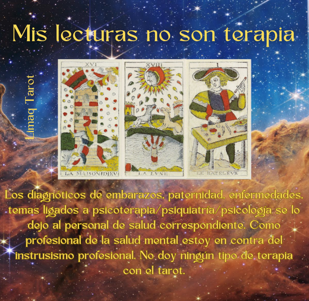 • Parte de mi código ético es no cometer intrusismo profesional. El tarot es un amigo, un consejero, no un terapeuta. Es por eso que; los diagnósticos de embarazos, paternidad, enfermedades, temas ligados a la psicoterapia/psiquiatría/psicología se lo dejo al personal de salud correspondiente. Como profesional de la salud mental, estoy en contra del instrusismo profesional. No doy ningún tipo de terapia con el tarot.